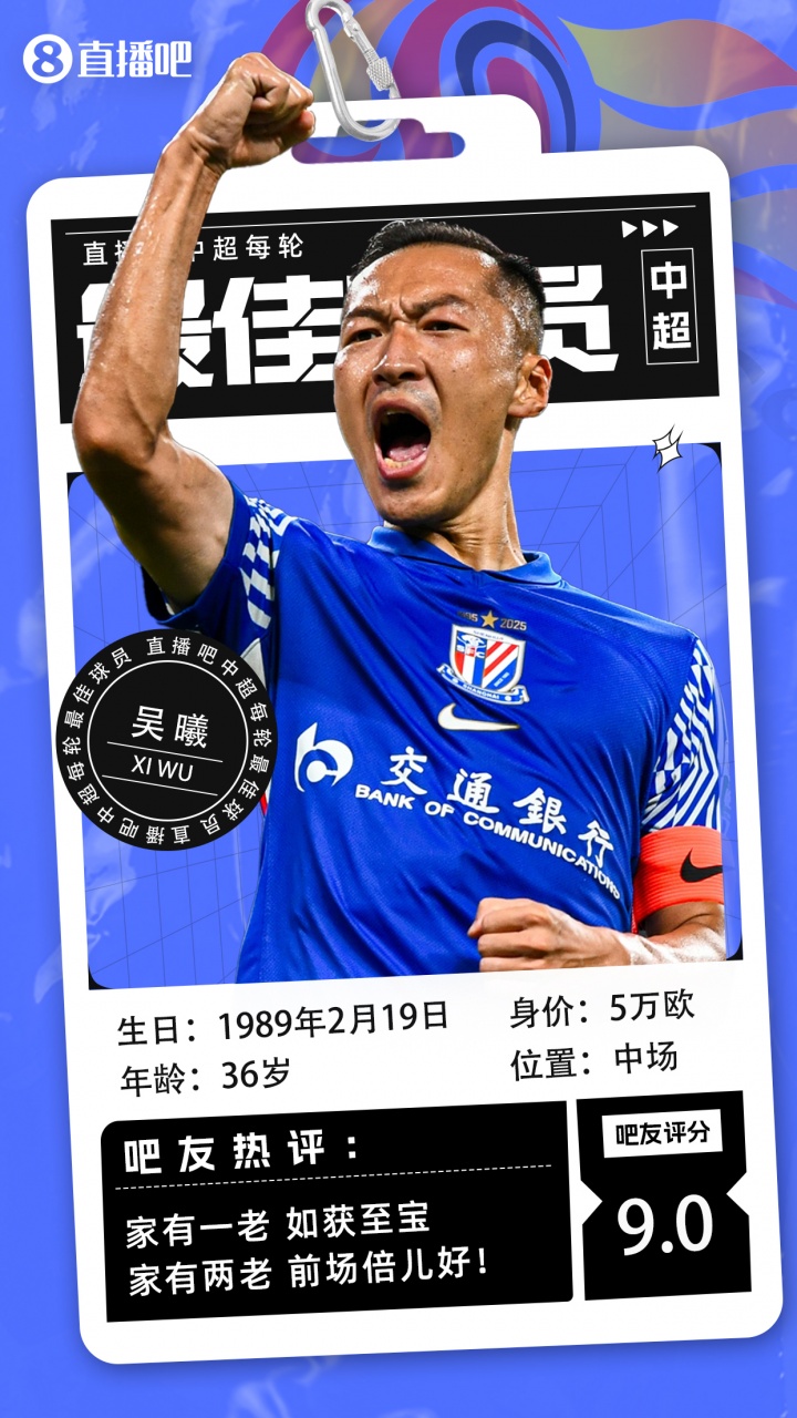 在中超第26轮的最佳球员评选中,上海申花的队长吴曦凭借出色表现荣膺桂冠。这位36岁的老将本轮比赛中大放异彩,打入两球,帮助申花在主场以6-1战胜梅州客家,继续向中超冠军发起冲击。这是吴曦本赛季第二次获得中超最佳球员的荣誉,展现出他在赛场上的不俗状态和领导能力。