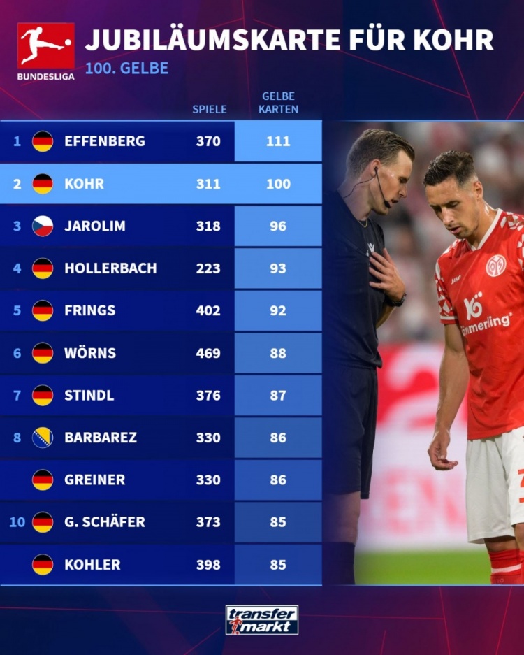 最后,舍费尔和科勒也以85张黄牌并列第十,前者在373场的比赛中展现了他的坚韧,而后者在398场中同样表现卓越。这份统计不仅展示了球员们在球场上的努力与付出,也让我们看到了德甲联赛的激情与火花。