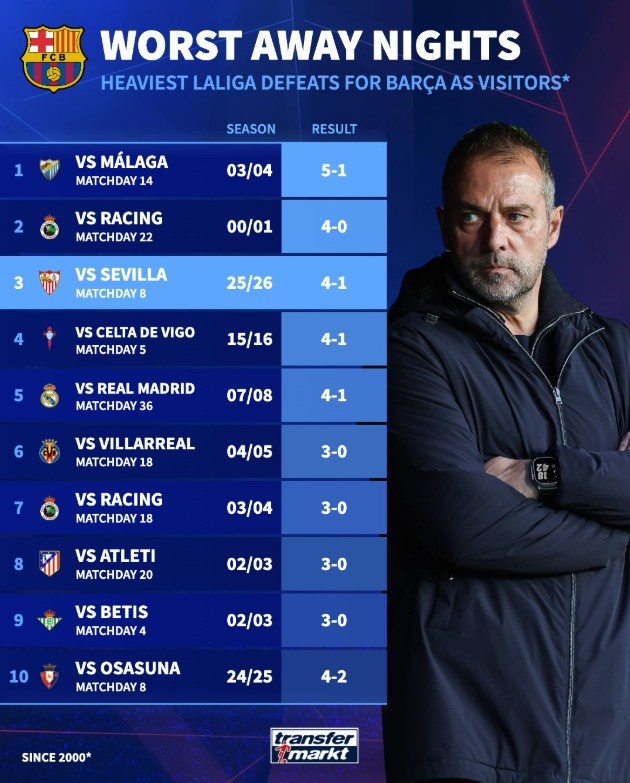 在10月7日的比赛中,巴萨在客场以1-4不敌塞维利亚,这一结果引起了广泛关注。根据德转的统计,巴萨在本世纪的西甲客场输球纪录显示,他们曾遭遇几次较为惨痛的失利,其中包括以1-5的比分输给马拉加,以及三次以1-4的比分落败。