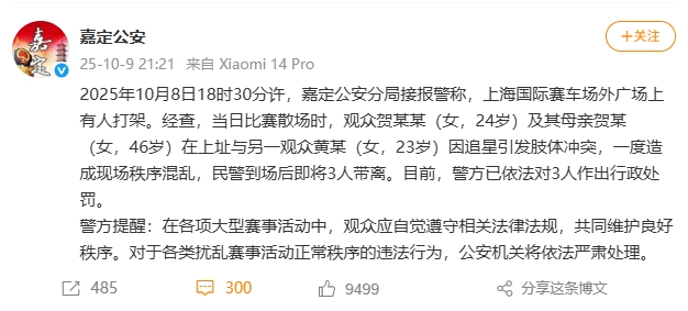 追星热潮竟引发肢体冲突 上海国际赛车场观众被警方“教育”